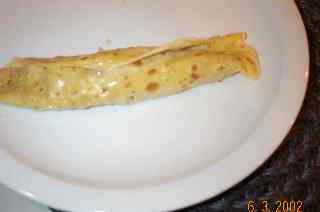Die fertigen Eierkuchen mit dem Fleisch füllen, in einen flache, eingefettete Auflaufform geben und im vorgeheizten Ofen bei 220 Grad zuerst zugedeckt, dann offen erhitzen.